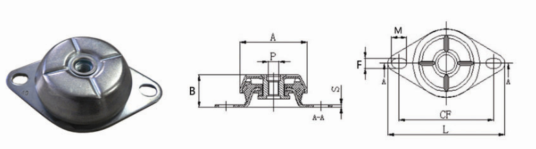 | 型號 | 橡膠硬度 IRHD (daN/mm) | A | B | P | F*M | CF | L | S | Average Stiffness平均值負(fù)荷(Kg/mm) | Max Load最大荷重(Kg) | Max Deflec.最大壓縮量(mm) |