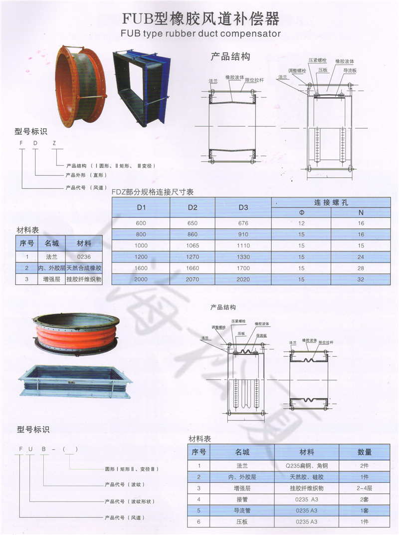 風(fēng)道橡膠補(bǔ)償器分為FDZ、FVB、FUB、XB四種型號(hào),由橡膠和橡膠一纖維織物復(fù)合材料、鋼制法蘭、套筒、保溫隔熱材料組成,主要用于各種風(fēng)機(jī)、風(fēng)管之間的柔性連接,其功能是減震、降噪、密封、耐介質(zhì)、便于位移和安裝,是環(huán)境保護(hù)領(lǐng)域中一種較為理想的減震、降噪、消煙除塵的配套件。